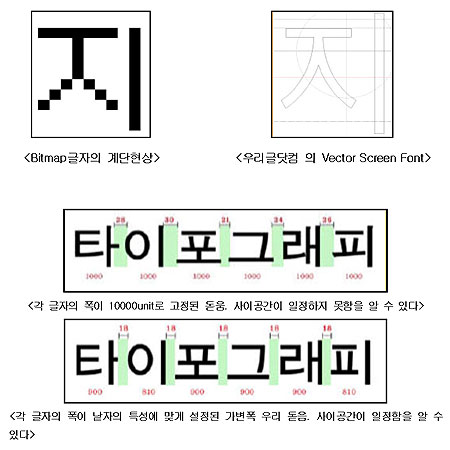 ÇöÀç ¿ì¸®°¡ ¸ð´ÏÅÍ·Î º¸°í ÀÖ´Â ÇÑ±Û ÆùÆ®´Â Àμâ Çѱۿ¡ ºñÇØ ¸Å¿ì Àú±ÞÇÑ ¼öÁØÀÌ´Ù. ±âÁ¸ ÆùÆ®´Â ºñÆ®¸ÊÀ» ±â¹ÝÀ¸·Î Çϱ⠶§¹®¿¡ °è´Ü Çö»óÀÌ ½ÉÇÏ°Ô ¹ß»ýÇÑ´Ù. ±×·¯³ª ¹éÅͽºÅ©¸°ÆùÆ®´Â ºñÆ®¸ÊÀ» ±¸ÇöÇÒ ¶§ ÀúÇØ»óµµ ¸ð´ÏÅÍ¿¡ Æ®·çŸÀÔÆùÆ®°¡ ¼±¸íÇÏ°Ô Ç¥ÇöÇÒ ¼ö ÀÖµµ·Ï ÆùÆ® ³»ºÎ¿¡¼ ·¡½ºÅͶóÀÌ¡(À̹ÌÁö ºÐ»çÀåÄ¡) È¿°ú¸¦ ÅëÇØ ±Û²ÃÀ» ´Ùµë°Ô µÈ´Ù.