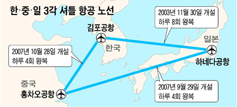¡ß¿ì¸®´Â ¿ÀÀü, Áß±¹Àº ¿ÀÈÄ ½Ã°£´ë ¼±È£=ÇÑ¡¤Áß¡¤ÀÏ 3±¹Àº Áö³ 6¿ù Á¦ÁÖµµ¿¡¼ ¿Ü±³Àå°ü ȸ´ãÀ» °®°í ±èÆ÷°øÇס¤È«Â÷¿À°øÇס¤Çϳ״ٰøÇ×À» ÀÕ´Â 3°¢ ¼ÅƲ(¿Õº¹) Ç×°ø »ç¾÷À» ÃßÁøÇϱâ·Î ÇÕÀÇÇß´Ù. ±èÆ÷~Çϳ״٠³ë¼±ÀÌ 2003³â 11¿ùºÎÅÍ ¹®À» ¿¬ ÀÌ·¡ Çϳ״Ù~È«Â÷¿À ³ë¼±ÀÌ Áö³ 9¿ù 29ÀÏ ¿îÇ×À» ½ÃÀÛÇß´Ù. ±èÆ÷~È«Â÷¿À ³ë¼± ¿îÇ׸¸ ³²°Ü ³õÀº »óȲÀÌ´Ù. ±èÆ÷~È«Â÷¿À ³ë¼±Àº ¿ì¸®Ãø 2°³ Ç×°ø»ç(´ëÇÑÇ×°ø¡¤¾Æ½Ã¾Æ³ªÇ×°ø), Áß±¹Ç×°ø»ç 2°³ µî 4°³ Ç×°ø»ç°¡ °¢°¢ ÇÏ·ç ¿Õº¹ 1ȸ¾¿ ¿îÇ×ÇÒ °èȹÀÌ´Ù. Áß±¹¿¡¼´Â »óÇÏÀÌ(ß¾ú)Ç×°ø¡¤µÕÆÎ(ÔÔÛ°)Ç×°øÀÌ Âü¿©ÇÒ °ÍÀ¸·Î ¾Ë·ÁÁ³´Ù.