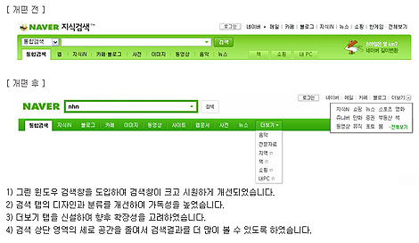 NHNÀÌ ¿î¿µÇÏ´Â ±¹³» ÃÖ´ë Æ÷ÅÐ ³×À̹ö(http://www.naver.com)°¡ Áö³ 8ÀÏ ÅëÇÕ°Ë»ö °á°ú »ç¿ëÀÚ ÀÎÅÍÆäÀ̽º(ÀÌÇÏ UI) °³ÆíÀ» ´ÜÇàÇß´Ù. ´Ü¼øÇÑ Àϰ³ °Ë»ö¿£ÁøÀÇ º¯È ÀÌ»óÀ» ÀǹÌÇÑ´Ù. °Ë»ö ½ÃÀåÁ¡À¯À² 70~80%ÀÎ ³×À̹ö·Î¼´Â Àüü ÀÎÅÍ³Ý »ç¿ë ÆÐÅÏ¿¡ Àý´ëÀûÀÎ ¿µÇâÀ» ÁÙ °ÍÀÌ ÀÚ¸íÇϱ⠶§¹®ÀÌ´Ù.