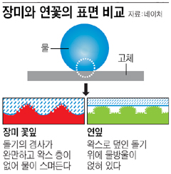 ²ÉÀ̳ª ÀÙ¿¡ ¹°¹æ¿ïÀÌ ¸ÎÈ÷´Â °ÍÀº ÀÚ¿¬¿¡¼ ÈçÇÑ ÀÏÀÌ´Ù. ÇÏÁö¸¸ Àå¹Ì¿Í ´Þ¸® ´ëºÎºÐÀÇ ²ÉÀ̳ª ÀÙ¿¡¼´Â ÀÛÀº ¶³¸²¿¡µµ ¹°¹æ¿ïÀÌ ¶³¾îÁø´Ù. ÀÌ °úÁ¤¿¡¼ ²ÉÀ̳ª À٠ǥ¸é¿¡ ¹¯Àº ¸ÕÁö³ª ¹ú·¹°¡ ¹°¹æ¿ï°ú ÇÔ²² ¾Ä°Ü ³»·Á°£´Ù. À̸¥¹Ù ÀÚ¿¬ÀÇ 'ÀÚ±â Á¤È(self cleaning)' ±â´ÉÀÌ´Ù. °úÇÐÀÚµéÀº À̸¦ ÀÌ¿ëÇØ ÀÚ±âÁ¤È ±â´ÉÀ» °®Ãá ¹æ¼ö¹°ÁúÀ» °³¹ßÇϰí ÀÖ´Ù.