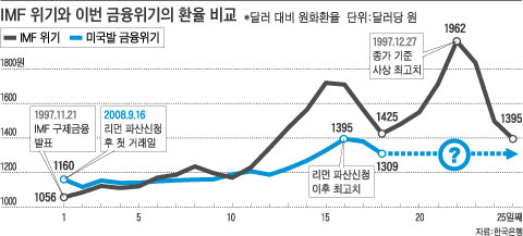 Çѱ¹ Á¤ºÎ°¡ IMF¿¡ ±¸Á¦±ÝÀ¶ ½ÅûÀ» ¹ßÇ¥ÇÑ 1997³â 11¿ù 21ÀÏ ÀÌÈÄ È¯À²ÀÇ ¿òÁ÷ÀÓ°ú, Áö³ 9¿ù 15ÀÏ(Çѱ¹½Ã°£) ¹Ì±¹ ÅõÀÚÀºÇà ¸®¸Õºê·¯´õ½ºÀÇ ÆÄ»ê½ÅûÀ¸·Î ÃË¹ßµÈ À̹ø ±ÝÀ¶À§±â ¶§ÀÇ È¯À² »óȲÀº °ÅÀÇ ÆÇ¹ÚÀÌ·Î ¿òÁ÷ÀδÙ.