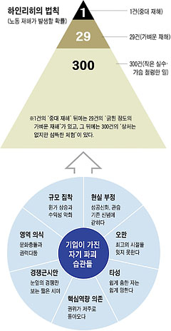"ÈçÈ÷ Å« »ç°í°¡ ÀϾ¸é ´ç»çÀÚ´Â '¼³¸¶ ÀÌ·± ÀÏÀÌ ÀϾ ÁÙ ¸ô¶ú´Ù'¸ç ¸¶Ä¡ ºÒÀÇÀÇ »ç°í¿´´ø °Íó·³ ¹Þ¾ÆµéÀ̰ųª º¯¸íÇÕ´Ï´Ù. ±×·¯³ª À̰ÍÀº »ç½ÇÀÌ ¾Æ´Õ´Ï´Ù. Áß´ëÇÑ »ç°í°¡ ³ª±â Àü¿¡´Â ¹Ýµå½Ã ¾î¶² ¡Á¶°¡ Àֱ⠸¶·ÃÀÌÁÒ. ¿¹ÄÁ´ë ÇÑ °ÇÀÇ ¾öû³ ´ëÇü »ç°í°¡ ¹ß»ýÇϱâ Àü¿¡´Â 29°ÇÀÇ °¡º¿î ÀçÇØ°¡ ÀÖ¾ú°í, ¶Ç ±×Àü¿¡´Â ´Ù¸¥ 300°ÇÀÇ ÀÛÀº ½Ç¼ö°¡ ¹ú¾îÁ³´Ù´Â °ÍÀÔ´Ï´Ù. À̸¦ 'ÇÏÀθ®È÷ÀÇ ¹ýÄ¢'À̶ó°í ÇÕ´Ï´Ù. °¡º¿î ÀçÇØ³ª ÀÛÀº ½Ç¼ö°¡ »ý°åÀ» ¶§ ÀûÀýÇÑ Á¶Ä¡¸¦ ÃëÇÑ´Ù¸é Ä¡¸íÀûÀÎ ½ÇÆÐ´Â ÃæºÐÈ÷ ¸·À» ¼ö ÀÖ½À´Ï´Ù."