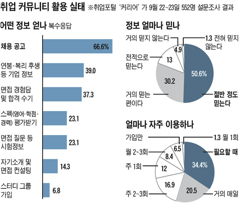 ¿äÁò °¡Àå Àαâ ÀÖ´Â ÇÑ Ãë¾÷ »çÀÌÆ®ÀÇ È¸¿ø ¼ö´Â 117¸¸¸í, ÇÏ·ç ¹æ¹®ÀÚ ¼ö¸¸ 10¸¸¸íÀÌ ³Ñ´Â´Ù. Ãë¾÷Àº ¼ºÀû¼ø(â÷)ÀÌ ¾Æ´Ï¶ó 'Á¤º¸¼ø'À̶õ ¾ê±â°¡ ³ª¿Ã Á¤µµ´Ù. Ãë¾÷ Áغñ»ýµé »çÀÌ¿¡ ¿Â¶óÀÎ Ãë¾÷ Ä¿¹Â´ÏƼ´Â ÀÔ»ç Á¤º¸¸¦ °øÀ¯ÇÏ°í ±â¾÷µéÀÇ »ý»ýÇÑ Ã¤¿ë Á¤º¸¸¦ ¾ò¾î°¥ ¼ö ÀÖ´Â Á¤º¸ÀÇ 'º¸°í(ÜÄÍ·)'·Î ºÒ¸°´Ù. ÇÏÁö¸¸ Ãë¾÷ Àü¹®°¡µéÀº Ä¿¹Â´ÏƼ Á¤º¸¸¦ À߸ø Ȱ¿ëÇÒ °æ¿ì ³¶ÆÐ¸¦ º¼ ¼ö ÀÖ´Ù°í ¸»ÇÑ´Ù.¿ÃÇØ »ó¹Ý±â ÇÑ ½Äǰȸ»ç¿¡ °øÃ¤·Î ÀÔ»çÇÑ À̸ð(27)¾¾´Â Ãë¾÷ Ä¿¹Â´ÏƼ »çÀÌÆ®¿¡ ¿Ã¶ó¿Â Á¤º¸¸¸ ¹Ï¾ú´Ù°¡ ÀÚÄ© Å« ½Ç¼ö¸¦ ÇÒ »·Çß´Ù. ¼·ù Åë°ú ÈÄ ¸éÁ¢À» ³²°ÜµÎ°í ÀÖ¾ú´ø À̾¾´Â Ä¿¹Â´ÏƼ¿¡¼ 'ÇØ´ç ±â¾÷ÀÇ ¸éÁ¢ °æÀï·üÀÌ 40´ë1ÀÌ´Ù', 'ÀÌ¹Ì ÇÕ°Ý ³»Á¤ÀÚ°¡ ÀÖ´Ù' ´Â ³»¿ëÀÇ ±ÛÀ» º» µÚ Çϸ¶ÅÍ¸é ¸éÁ¢À» Æ÷±âÇÒ »·Çß´ø °ÍÀÌ´Ù. ÇÏÁö¸¸ ¸éÁ¢ °æÇèÀÌ¶óµµ ½×¾Æ º¸ÀÚ´Â ¸¶À½À¸·Î ¸éÁ¢Àå¿¡ °¡ºÃ´õ´Ï ½ÇÁ¦ °æÀï·üÀº 4´ë1¿¡ ºÒ°úÇß´Ù.