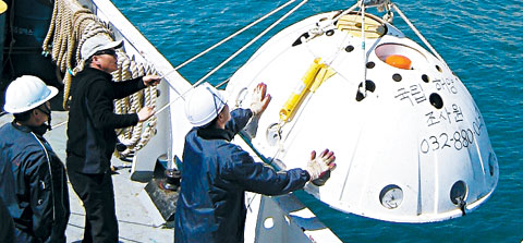 - ¡ã ±¹¸³ÇؾçÁ¶»ç¿ø ¿¬±¸¿øµéÀÌ ¿©¼ö ¾Õ¹Ù´Ù¿¡¼ Á¶·ù ¿¡³ÊÁö¸¦ ÃøÁ¤ÇÏ´Â µÕ±Ù ÇüÅÂÀÇ À¯¼Ó°üÃø±â¸¦ ¹Ù´å¼ÓÀ¸·Î ³»¸®°í ÀÖ´Ù. Á¶·ù ¿¡³ÊÁö´Â ¹Ù´å¹°ÀÇ È帧À» Àü±â ¿¡³ÊÁö ·Î ¹Ù²Ù´Â ½ÅÀç»ý¿¡³ÊÁöÀÌ´Ù./±¹¸³ÇؾçÁ¶»ç¿ø Á¦°ø