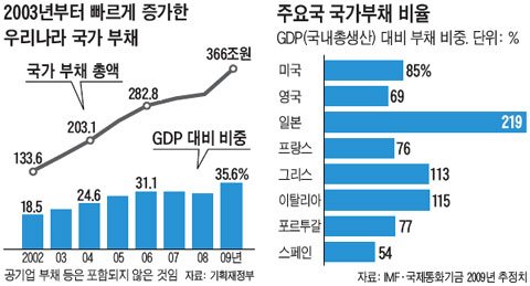 ¿ì¸®³ª¶óÀÇ ±¹°¡ ºÎä´Â ¿ÃÇØ »ç»ó óÀ½À¸·Î 400Á¶¿øÀ» ³Ñ¾î¼°Ô µÈ´Ù. 407Á¶2000¾ï¿øÀ¸·Î GDPÀÇ 36.1%¸¦ Â÷ÁöÇÑ´Ù´Â °ÍÀÌ Á¤ºÎÀÇ ¿¹»óÀÌ´Ù. ¹Ì±¹(85%¡¤2009³â ±âÁØ), ÀϺ»(219%)¿¡ ºñÇÏ¸é °ÆÁ¤ÇÒ ¼öÁØÀº ¾Æ´Ï´Ù. ÇÏÁö¸¸ ±¹°¡ ºÎäÀÇ Áõ°¡ ¼Óµµ°¡ ³Ê¹« ºü¸£´Ù´Â °ÍÀº ¹®Á¦´Ù. ¿Üȯ À§±â Á÷ÈÄÀÎ 1998³â 93Á¶6000¾ï¿øÀ» ±âÁØÁ¡À¸·Î º¸¸é ¿ÃÇØ±îÁö 12³â ¸¸¿¡ 4.4¹è³ª ´Ã¾î³´Ù.