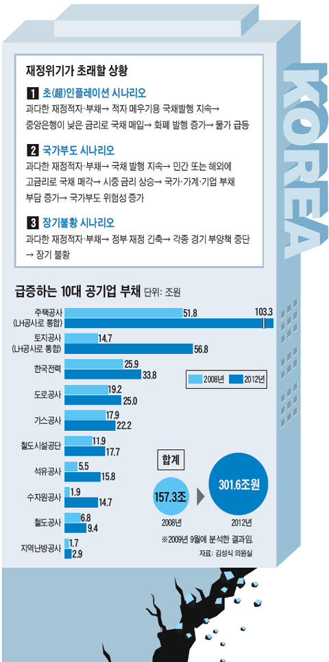 ±Þ°ÝÇÑ Áõ°¡¼Óµµº¸´Ù ´õ Å« ¹®Á¦´Â ¼û¾î ÀÖ´Â °ø±â¾÷ ºÎäÀÌ´Ù. 24°³ °ø±â¾÷ÀÇ ºÎä´Â 2008³â ¸» ÇöÀç 177Á¶1000¾ï¿ø¿¡ ´ÞÇÑ´Ù. Áõ°¡¼¼µµ °¡ÆÄ¸£´Ù. Çѱ¹Àü·Â¡¤Çѱ¹µµ·Î°ø»ç µî 10´ë °ø±â¾÷ÀÇ ºÎä´Â 2008³â 157Á¶¿øÀ̾úÁö¸¸ 2012³â¿¡´Â 301Á¶6000¾ï¿øÀ¸·Î ±ÞÁõÇÒ Àü¸ÁÀÌ´Ù. 'º¸¼öÀûÀÎ' °ø±â¾÷µéÀÌ ÀÚü Àü¸ÁÇÑ ±Ý¾×ÀÎ ¸¸Å ´õ ´Ã¾î³¯ °¡´É¼ºÀÌ Å©´Ù. °ø±â¾÷ ºÎ並 Æ÷ÇÔ½Ãų °æ¿ì ¿ÃÇØ ¸» ±¹°¡ 乫´Â 584Á¶3000¾ï¿øÀ» ³ÑÀ» Àü¸ÁÀÌ´Ù. ÀÌ´Â GDPÀÇ 51.8%¸¦ ³Ñ´Â °ÍÀÌ´Ù. ±×·¯³ª ±âȹÀçÁ¤ºÎ °ü°èÀÚ´Â "´Ã¾î³ °ø±â¾÷ ºÎ並 ¸ðµÎ ±¹°¡ ºÎä ¼º°ÝÀ¸·Î ºÐ·ùÇÒ ¼ö ¾ø´Ù"°í ¹Ý¹ÚÇß´Ù.