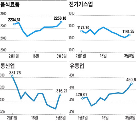 ÀüÅëÀûÀ¸·Î °æ±â Çϰ±â³ª ÁÖ°¡ Á¶Á¤±â¿¡´Â '°æ±â ¹æ¾îÁÖ'°¡ »ó´ëÀûÀ¸·Î °¼¼¸¦ º¸ÀδÙ. °æ±â ¹æ¾îÁÖ¶õ À½½Ä·á¡¤Á¦¾à¡¤Åë½Å¡¤À¯Åë µî °æ±âº¯µ¿¿¡ µÐ°¨ÇÑ ¾÷Á¾À» ¸»ÇÑ´Ù. °Ç¼³À̳ª ±ÝÀ¶ µî °æ±â¿¡ ¹Î°¨ÇÏ°Ô ¹ÝÀÀÇÏ´Â ¾÷Á¾°ú ´Þ¸® »ýÇÊǰÀû ¼º°ÝÀÌ ÀÖ¾î °æ±â°¡ ³ªºüÁ®µµ ±â¾÷ ½ÇÀû¿¡ Å« ÁöÀåÀ» ¹ÞÁö ¾Ê±â ¶§¹®ÀÌ´Ù. Áö³ 1¿ù Çϼø ÀÌÈÄ ÁֽĽÃÀåÀÌ Á¶Á¤¿¡ Á¢¾îµé¸é¼ Áõ±Ç¾÷°è¿¡¼´Â °æ±â ¹æ¾îÁÖ Áß½ÉÀ¸·Î ¼øÈ¯¸Å°¡ ÀÌ·ïÁú °ÍÀ̶ó´Â Àü¸ÁÀÌ ¸¹¾Ò´Ù. °æ±â¼±ÇàÁö¼ö°¡ ¿Ã 1ºÐ±â¸¦ Á¤Á¡À¸·Î ²ªÀÏ °ÍÀ̶ó´Â ¿¹»óµµ ÀÌ·± Àü¸ÁÀ» °Åµé¾ú´Ù.±×·¯³ª ÃÖ±Ù È帧À» º¸¸é ¹æ¾îÁÖ°¡ Á¦´ë·Î ÈûÀ» ¸ø ¾²´Â ¸ð½ÀÀÌ´Ù. ÄÚ½ºÇÇÁö¼ö°¡ Áö³ 1¿ù 21ÀÏ 1722Æ÷ÀÎÆ®¸¦ Âï°í ³ª¼ 3.6% Ç϶ôÇÏ´Â µ¿¾È Àü±â°¡½º¡¤Åë½Å¡¤ÀǾàǰ¾÷Á¾ Áö¼ö´Â 4~10%³ª ºüÁ³´Ù. ÃÖ±Ù Áõ½Ã¿¡¼ ¹æ¾îÁÖ°¡ À̸§°ªÀ» Á¦´ë·Î ¸øÇÏ´Â ÀÌÀ¯´Â ¹»±î.