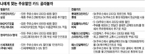 ƯÁ¤ ÁÖÀ¯¼Ò»Ó ¾Æ´Ï¶ó ¸ðµç ÁÖÀ¯¼Ò¿¡¼ ÁÖÀ¯ ÇÒÀÎ ÇýÅÃÀ» ¹ÞÀ» ¼ö ÀÖ´Â ÁÖÀ¯ÇÒÀÎ Ä«µåµéÀÌ ¼Ó¼Ó µîÀåÇϰí ÀÖ´Ù. À̸¥¹Ù ¹ü¿ë(ÛñéÄ) ÁÖÀ¯ÇÒÀÎ Ä«µåµéÀÌ´Ù. ÀÚµ¿Â÷¸¦ ¸ô°í °¡´Ù°¡ ±â¸§ÀÌ ¶³¾îÁö¸é ´«¿¡ º¸ÀÌ´Â ÁÖÀ¯¼Ò ¾Æ¹« °÷¿¡³ª µé¾î°¡ ±â¸§À» ³ÖÀ» ¼ö ÀÖÀ¸´Ï ¸Å¿ì Æí¸®ÇÏ´Ù. ÇÏÁö¸¸ ÇÒÀÎÀ² Ãø¸é¿¡¼´Â ƯÁ¤ ÁÖÀ¯¼Ò¿¡¼¸¸ ÇÒÀιÞÀ» ¼ö ÀÖ´Â Àü¿ë(îöéÄ) ÁÖÀ¯ÇÒÀÎ Ä«µå¿¡ ºñÇØ ºÒ¸®ÇÒ ¼öµµ ÀÖ´Ù. ±×·¡¼ ÁÖÀ¯Ä«µå¸¦ ¼±ÅÃÇÒ ¶§¿¡´Â Æò¼ÒÀÇ ÁÖÀ¯½À°üÀ» Àß °¨¾ÈÇØ ÇýÅÃÀ» µûÁ®ºÁ¾ß ÇÑ´Ù.¡ß¹ü¿ëÄ«µå, ¸ðµç ÁÖÀ¯¼Ò¿¡¼ OK