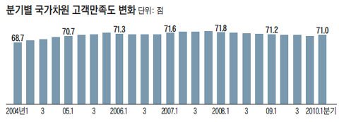 ¿ÃÇØ 1ºÐ±â ±¹°¡ Â÷¿øÀÇ °í°´¸¸Á·µµ´Â 71.0Á¡À¸·Î ÀÛ³â 1ºÐ±â¿¡ ºñÇØ¼´Â 0.2Á¡ Ç϶ôÇßÀ¸³ª ÀÛ³â 4ºÐ±âº¸´Ù´Â 0.4Á¡ ¿Ã¶ú´Ù. À̹ø Á¶»ç´Â Áö³ 1~2¿ù Àü±¹ 5´ë ±¤¿ª½Ã(ÁöÇÏö°ú ±¹³»¡¤±¹Á¦Ç×°ø, ¿µÈ°üÀº ½ÇÁ¦ ¼ºñ½º°¡ Á¦°øµÇ´Â Áö¿ª ±âÁØ)¿¡¼ °í°´ 1¸¸4288¸íÀ» ´ë»óÀ¸·Î ÇÑ ¸éÁ¢Á¶»ç¿´´Ù.