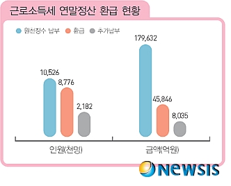 ±Ù·Î¼Òµæ¼¼ ¿¬¸»Á¤»ê ȯ±Þ ÇöȲÀ» º¸¸é ¿øÃµÂ¡¼ö ³³ºÎÀÚ 1052¸¸6000¸í Áß 877¸¸6000¸íÀÌ È¯±ÞÀ», 218¸¸2000¸íÀÌ Ãß°¡³³ºÎ¸¦ ÇÏ´Â °ÍÀ¸·Î Áý°èµÆ´Ù. ¿øÃµÂ¡¼ö ±Ý¾×Àº 17Á¶9632¾ï ¿øÀ¸·Î ȯ±Þ¾×Àº 4Á¶5846¾ï ¿ø, Ãß°¡³³ºÎ ±Ý¾×Àº 8035¾ï ¿øÀÌ¿´´Ù.