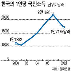 ¿ì¸®³ª¶óÀÇ 1ÀÎ´ç ±¹¹Î¼ÒµæÀº 1995³â 1¸¸1735´Þ·¯¸¦ ±â·ÏÇÏ¸é¼ ¿ª»ç»ó óÀ½À¸·Î 1¸¸´Þ·¯¸¦ ³Ñ¾î¼¹°í, 12³â ¸¸ÀÎ 2007³â 2¸¸1695´Þ·¯·Î Àá½Ã 2¸¸´Þ·¯¸¦ ³Ñ¾ú´Ù°¡ ±ÝÀ¶À§±â°¡ ¹ß»ýÇÑ À̵ëÇØ ´Ù½Ã 1¸¸´Þ·¯´ë·Î ÁÖÀú¾É¾Ò´Ù. °ú°Å 2¸¸´Þ·¯¸¦ ´Þ¼ºÇÑ ¼±Áø±¹µéÀÌ 1¸¸´Þ·¯¿¡¼ 2¸¸´Þ·¯°¡ µÇ±â±îÁö Æò±Õ 10.1³âÀÌ °É·È´Âµ¥, ¿ì¸®³ª¶ó´Â »ç½Ç»ó 15³âÀ» ³Ñ±â°í ÀÖ´Â ¼ÀÀÌ´Ù.