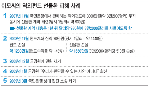 Áö³ 2008³â ±Û·Î¹ú ±ÝÀ¶À§±â Á÷ÈÄ ¼ÒÀ§ '±øÅëÆÝµå'¸¦ ¾ç»êÇÏ¸ç ±ÝÀ¶ÅõÀÚÀڵ鿡°Ô Å« ÇÇÇØ¸¦ Áá´ø ÀºÇàµéÀÇ ¿ª¿Ü(æ´èâ)ÆÝµå(³ª¶ó ¹Û¿¡¼ ¸¸µé¾îÁø ÆÝµå) ¼±¹°È¯ ÆÇ¸Å°¡ ±ÝÀ¶°¨µ¶¿øÀÇ Áö½Ã¿¡ µû¸¥ °ÍÀ¸·Î È®ÀεƴÙ.5ÀÏ º»Áö°¡ ÀÔ¼öÇÑ ¹®°Ç¿¡ µû¸£¸é ±¹¹ÎÀºÇàÀº ¹ý¿ø¿¡ Á¦ÃâÇÑ ÀÚ·á¿¡¼ "(±ÝÀ¶°¨µ¶¿øÀÌ) ¿ª¿ÜÆÝµåÀÇ °æ¿ì Àû±ØÀûÀ¸·Î ¼±¹°È¯°è¾à ÅõÀÚ±ÇÀ¯¸¦ ÇÏ¿© À̸¦ ü°áÇϵµ·Ï Áö½ÃÇß´Ù"°í ¹àÈù °ÍÀ¸·Î µå·¯³µ´Ù. ±¹¹ÎÀºÇàÀÇ Á¦Ãâ ÀÚ·á´Â ¶Ç "ÅõÀÚÀÚµéÀÇ ÁÖÀåÀÌ ¸Â´Ù¸é ±¹°¡¸¦ »ó´ë·Î ¼ÕÇØ¹è»óû±¸¸¦ ÇÏ´Â °ÍÀÌ Å¸´çÇÏ´Ù"°í µ¡ºÙ¿´´Ù. ±×µ¿¾È ±Ý°¨¿øÀº ÀºÇàÀÌ °¢ÀÚÀÇ ÆÇ´Ü¿¡ µû¶ó ¼±¹°È¯À» Ãë±ÞÇß´Ù´Â ÀÔÀåÀ» ÃëÇϸç Ã¥ÀÓÀ» ȸÇÇÇØ¿Ô´Ù. ÀºÇàµéÀº Áö³ 2007³â 10¿ù ÇöÀç ¾à 9Á¶4000¾ï¿ø ±Ô¸ð(¼øÀÚ»ê ÀÜ¾× ±âÁØ)ÀÇ ¿ª¿ÜÆÝµå¸¦ ÆÇ¸ÅÇßÀ¸¸ç, ÆÇ¸Å¾× Àý¹Ý ÀÌ»óÀÇ ±Ô¸ð¸¸Å ¼±¹°È¯ °è¾àÀ» ü°áÇÑ °ÍÀ¸·Î ÃßÁ¤µÈ´Ù. ¼±¹°È¯ °è¾àÀ̶õ ȯÀ² º¯µ¿¿¡ µû¸¥ ¼Õ½ÇÀ» ÇÇÇϱâ À§ÇØ ÅõÀÚÀÚ¿Í ÀºÇà µî ÆÝµå ÆÇ¸Å»ç°¡ ¸Î´Â ȯÇìÁö °è¾àÀ» ¸»ÇÑ´Ù.