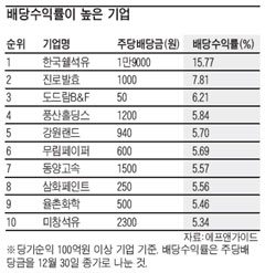 À۳⠹è´çÀÇ ÁöÁ¸(ò¸ðî)Àº ´Ù±¹Àû ¼®À¯È¸»ç '·Î¿ ´õÄ¡ ½©'ÀÇ Çѱ¹ ÀÚȸ»çÀÎ Çѱ¹½©¼®À¯¿´´Ù. ÀÌ È¸»ç´Â Áö³ÇØ ¿¬¸»¿¡¸¸ ¹«·Á ÁÖ´ç 1¸¸9000¿øÀ» ¹è´ç, Àý´ë¾×¼ö³ª ¹è´ç¼öÀÍ·ü ¸é¿¡¼ ´Ü¿¬ 1À§¸¦ Â÷ÁöÇß´Ù. ¹è´ç¾×À» ÁÖ°¡·Î ³ª´« ¹è´ç¼öÀÍ·üÀº 15.4%³ª µÆ´Ù. ´ç±â¼øÀÌÀÍ 100¾ï¿ø ÀÌ»ó ±â¾÷ Áß¿¡¼´Â Áø·Î¹ßÈ¿¿Í µµµå¶÷B&F°¡ °¢°¢ 7.81%, 6.21%ÀÇ ¹è´çÀ» ½Ç½ÃÇØ ¹è´ç¼öÀÍ·ü 2À§, 3À§¿¡ ¿Ã¶ú´Ù. dz»êȦµù½º, °¿ø·£µå, ¹«¸²ÆäÀÌÆÛ, µ¿¾ç°í¼Ó, »ïÈÆäÀÎÆ® µîµµ 1³âÂ¥¸® Á¤±â¿¹±Ý ÀÌÀÚ¸¦ ¿ôµµ´Â 5.5% ÀÌ»óÀÇ ¹è´ç¼öÀÍ·üÀ» ¾È°å´Ù.