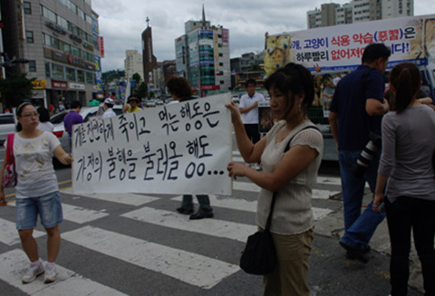 - ¡ã °³°í±â À¯ÅëÀ» ¹Ý´ëÇÏ´Â ½Ã¹ÎµéÀÌ ¸ð¶õ½ÃÀå ¾Õ¿¡¼ '°³¸¦ ÀÜÀÎÇÏ°Ô Á×ÀÌ°í ¸Ô´Â ÇൿÀº °¡Á¤ÀÇ ºÒÇàÀ» ºÒ·¯¿Ã Çൿ..'À̶ó°í ÀûÈù Ç÷¡Ä«µå¸¦ µé°í ÀÖ´Ù./°íÁ¤Çö ÀÎÅϱâÀÚ