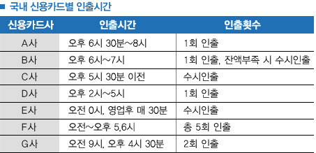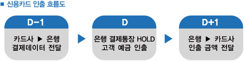 º¸Åë Ä«µå´ë±Ý ÀÎÃâÀº °áÁ¦ÀÏ Àü³¯ Ä«µå»ç°¡ ÀºÇà¿¡ µ¥ÀÌÅ͸¦ ³Ñ°ÜÁÖ¸é °áÁ¦ÀÏ ´çÀÏ ÀºÇàÀÌ ÇØ´ç °í°´ °èÁ¿¡¼ ÀÎÃâÀ» ÇÏ°í ±× ´ÙÀ½³¯ ÀºÇàÀÌ Ä«µå»ç¿¡ µ·À» ¼Û±ÝÇÏ´Â ±¸Á¶·Î µÅ ÀÖ´Ù. ÀÌ °úÁ¤¿¡ ¸¹Àº µ¥ÀÌÅÍ¿Í Àü»ê¾÷¹«°¡ Æ÷ÇԵDZ⠶§¹®¿¡ Ä«µå»çº°·Î ÀÎÃ⠽ð£ÀÌ ´Ù¸¦ ¼ö¹Û¿¡ ¾ø´Ù´Â °ÍÀÌ ÀºÇà°ú Ä«½º»çÀÇ ¼³¸íÀÌ´Ù.