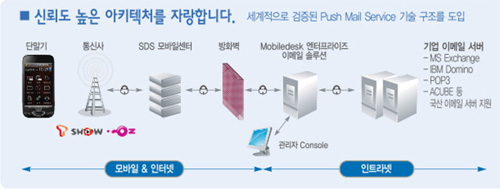 ¸ð¹ÙÀÏ µ¥½ºÅ©´Â À̸ÞÀÏÀÌ ¿ÔÀ» ¶§ ½Ç½Ã°£À¸·Î Àü¼ÛÇØÁÖ´Â ¡®Çª½¬¡¯ ±â¼ú ±â¹ÝÀÇ EMS(Enterprise Mobility Service)·Î, 24½Ã°£ ¾îµð¼³ª ¾÷¹«¸¦ ¼öÇàÇÒ ¼ö ÀÖ´Â ½º¸¶Æ® ¿ÀÇǽº ¼ºñ½º´Ù. ½º¸¶Æ®ÆùÀ¸·Î ±â¾÷ ½Ã½ºÅÛ¿¡ Á¢¼ÓÇØ ¸ÞÀϰú °áÀç, ÀÏÁ¤°ü¸®, Á÷¿ø Á¶È¸ µî ¸ðµç ¾÷¹«¸¦ ó¸®ÇÒ ¼ö ÀÖ°í ¸ðµç Åë½Å»ç »ç¿ëÀÌ °¡´ÉÇÑ °³¹æÇü ¼ºñ½ºµµ Á¦°øÇÑ´Ù.