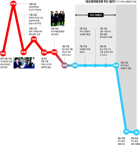 ³×¿À¼¼¹ÌÅ×Å©´Â °¨»çÀÇ°ß °ÅÀý·Î Çѱ¹°Å·¡¼Ò¿¡¼ »óÀåÆóÁö¸¦ Å뺸¹Þ¾Ò°í 3¿ù 25ÀϺÎÅÍ Áֽİŷ¡°¡ Á¤ÁöµÆ´Ù. ½Ã°¡ÃÑ¾× 4083¾ï¿øÀ¸·Î ÄÚ½º´Ú ±â¾÷ °¡¿îµ¥ 27À§ ±Ô¸ðÀÇ ±â¾÷À̾ú´Ù. ´ç½Ã Áõ±Ç°¡ ÀϺο¡¼± "¼³¸¶ ³×¿À¼¼¹ÌÅ×Å©°¡ »óÀåÆóÁöµÉ Á¤µµ·Î ºÎ½ÇÇÒ±î" ÇÏ´Â ¹Ý½Å¹ÝÀÇÇÏ´Â ºÐÀ§±â°¡ ÀÖ¾ú´Ù°í ÇÑ´Ù.