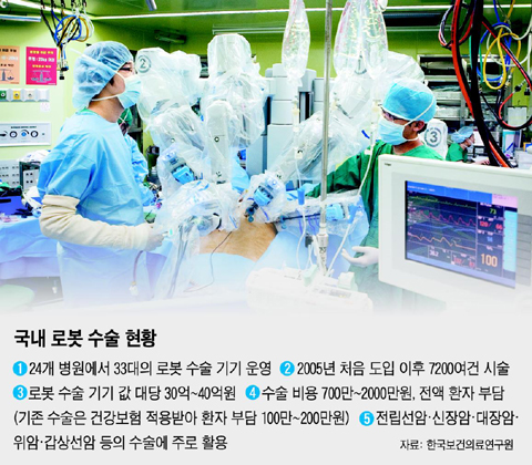 ¾ç ±³¼ö´Â Áö³ 2005³â ±¹³»¿¡ ·Îº¿ ¼ö¼úÀ» óÀ½ µé¿©¿Í ½ÃÇàÇÑ ÀÇ»ç·Î, ±×°¡ ¼ÓÇÑ ¼¼ºê¶õ½ºº´¿øÀº ·Îº¿ ¼ö¼úÀÌ È°¹ßÇÑ º´¿ø Áß Çϳª´Ù. ÇöÀç ·Îº¿ ¼ö¼úÀº Àü±¹ 27°³ º´¿ø¿¡¼ ½ÃÇàÇϰí ÀÖÀ¸¸ç, Áö±Ý±îÁö 7200¿©°ÇÀÇ ¼ö¼úÀÌ ÀÌ·ïÁ³´Ù. ¼ö¼ú ºñ¿ëÀº 700¸¸~2000¸¸¿øÀ¸·Î, °Ç°º¸ÇèÀÌ Àû¿ëµÇÁö ¾Ê±â ¶§¹®¿¡ Àü¾× ȯÀÚ ºÎ´ãÀÌ´Ù. ±âÁ¸ ¼ö¼ú¿¡ ºñÇØ 3~7¹è ºñ½Î´Ù.