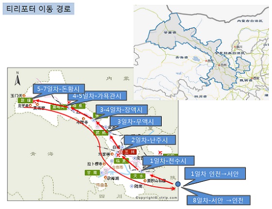 À̹ø Ƽ¸®Æ÷ÅÍ´Â ¡°¸®¾ó ½ÇÅ©·Îµå¡±¸¦ °æÇèÇϱâ À§ÇØ °¨¼÷¼º ³ÁÖ°¡ ¾Æ´Ñ ¼¶¼¼º ¼¾È¿¡¼ Ãâ¹ßÇÑ´Ù. ¼¾ÈÀº ½ÇÅ©·ÎµåÀÇ ±âÁ¡À¸·Î¼ ¸¹Àº ¼¿ª»óÀΰú Áß±¹ÀΰúÀÇ ±³·ù·Î ¹ø¼ºÇß´ø °÷ÀÌ´Ù. ¿¾ ½ÇÅ©·Îµå ³ë¼±À» µû¶ó Â÷·®À¸·Î ¼¾È¿¡¼ Ãâ¹ßÇÏ¿© °¨¼÷¼ºÀÇ 6°³ µµ½Ã õ¼ö½Ã(Ƽ¾Ø½¦ÀÌô¸â©), ³ÁÖ½Ã(¶õÀú¿ì兰ñ¶), ¹«À§½Ã(¿ì¿þÀÌÙëêÎ), Àå¾×½Ã(À忹张äú), °¡¿å°ü½Ã(ÀðÀ§꽌Ê©峪关), µ·È²½Ã(µÐȲÔÄüÓ)¸¦ Áö³´Ù. µ·È²ÀÇ ¾ç°ü(¾ç꽌阳关), ¿Á¹®°ü(À§¸Õ꽌è¬门关)À» ³ª¼¸é ¹Ù·Î ¼¿ªÀ¸·Î ¿¬°áµÇ±â¿¡ µ·È²Àº ¼¿ªÀ¸·Î µé¾î°¡´Â °ü¹®À̱⵵ Çß´Ù.