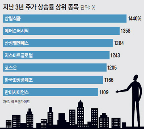 기간을 지난 3년으로 늘리면 10루타 종목 10개 가운데 6개가 화장품을 비롯한 중국 수혜 종목이다. 아모레퍼시픽과 와이지엔터테인먼트의 '문샷', 토니모리 등에 납품하는 화장품 회사 코스온의 주가등락률은 1205%를 기록했다. 제빵·제과 전문점 '파리바게뜨'로 유명한 SPC그룹 계열사 삼립식품도 중국을 중심으로 해외 사업을 확대한다는 전망에 3년간 주가가 1440% 상승했다.