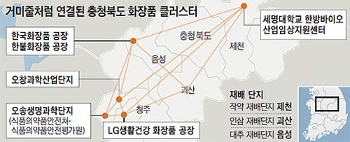 이런 공장에서 쓰이는 한방(韓方) 원료 공장이나 연구소도 승용차로 30분 이내 거리에 있는 충북에 밀집해 있다. 제천에는 세명대 한방바이오산업임상지원센터가 자리 잡고 있고 한국화장품·한불화장품 공장이 있는 음성은 노화 방지에 효과가 있는 대추, 괴산은 피부의 수분 유지와 주름·미백에 좋은 인삼(人蔘)의 주 재배지다.