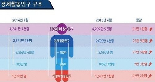 15세 이상 인구는 4월말 기준 4292만5000명으로 1년전보다 51만1000명 늘었다. 이 중 취업자와 실업자를 합친 경제활동인구는 2695만4000명으로 작년 4월보다 23만9000명 늘었다. 취업도 실업도 아닌 상태인 비경제활동인구는 1597만1000명으로 전년동월대비 27만2000명 증가했다.