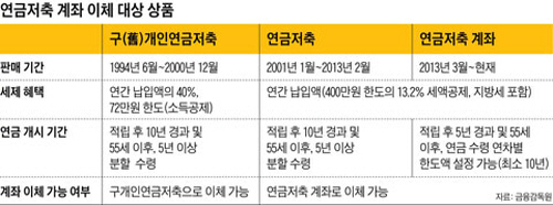 이 중 옛 개인연금을 갖고 있는 사람은 특히 신중하게 판단해야 한다. 2000년까지만 팔렸던 옛 개인연금은 연간 납입액의 40%(72만원 한도)에 대해 소득공제를 해 주고, 노후에 타는 연금액은 비과세를 해주는 상품이다. 김욱원 NH투자증권 차장은 "구개인연금은 돈을 부을 때와 연금으로 탈 때 양쪽 모두 세제 혜택을 주는 최고의 금융상품"이라며 "고금리 확정이율로 연금을 주는 경우도 많기 때문에 움직이지 않는 것이 유리하다"고 말했다. 2001년부터 판매된 연금저축보험에 가입한 사람들은 수수료·경험생명표·최저보증이율·투자성향 등 4가지 변수를 꼭 따져봐야 한다.