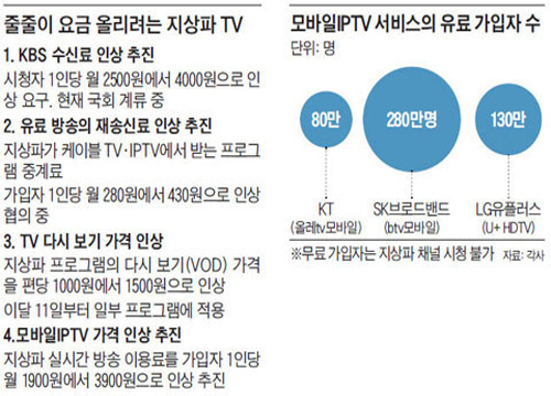 한국IPTV방송협회의 고위 관계자는 17일 "KBS·MBC·SBS 등 지상파 3사가 최근 모바일 IPTV에 채널을 공급하는 가격을 가입자 1인당 월 1900원에서 월 3900원으로 갑절로 인상하겠다는 공문을 보냈다"고 말했다. 통신사들은 지상파와 계약을 맺고 해당 방송 채널을 모바일 IPTV로 내보내고 있다. 기본적으로는 유료 서비스지만 우수 고객에게는 무료로 서비스하기도 한다. 현재 올레tv모바일(KT)·btv모바일(SK브로드밴드)·U+HDTV(LG유플러스) 등 세 모바일 IPTV 서비스로 지상파 채널을 시청하는 유료 서비스는 총 490만명이 이용하고 있다.