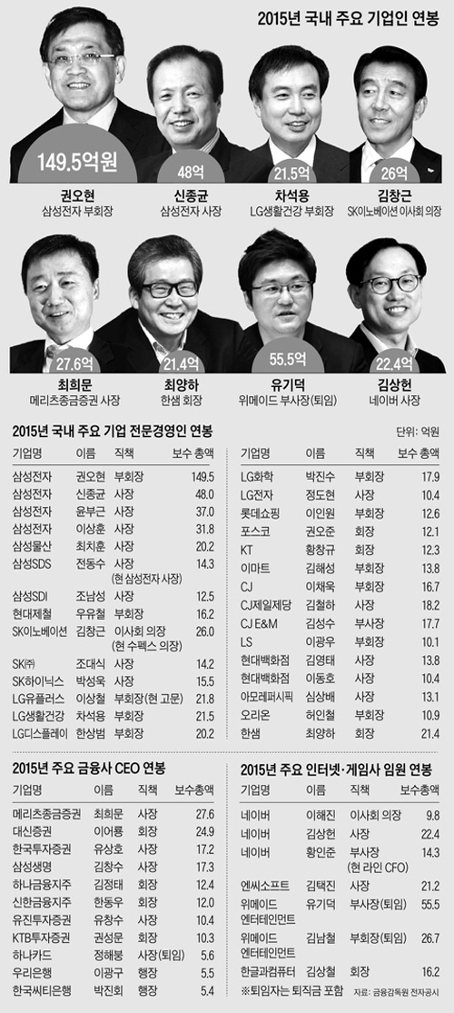 본지가 30일 삼성전자·현대차·SK텔레콤·LG전자 등 국내 상장사들이 금융감독원에 제출한 사업 보고서에 나오는 5억원 이상 연봉자 명단을 분석한 결과, '실적 따라 보상한다'는 보수 체계가 정착되고 있음이 확연히 드러났다. 또 경기 불황 여파로 전년(2014년)에 비해 연봉이 줄어든 경우가 많았으며, 극심한 실적 부진을 겪고 있는 조선·중공업 등에서는 연봉 삭감이 두드러졌다. IT 업계 등에서는 오너보다 더 많은 연봉을 받는 전문 경영인들이 늘어나는 추세를 보였다. 직원 평균 연봉(스톡옵션 포함) 1억원이 넘는 기업은 삼성전자, 삼성증권, SK텔레콤, KB금융, 신한금융, 하나금융, 카카오, 휴맥스홀딩스, 대한유화 등 15곳이었다.