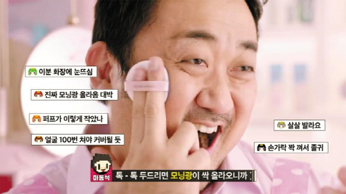 - ▲ 배우 마동석이 출연하는 '에뛰드 애니쿠션 크림필터' 광고. 이 제품은 '마블리(사랑스럽다는 뜻의 마동석 별명) 쿠션'이란 별칭을 얻으며 화제를 모았다. /유튜브 캡처