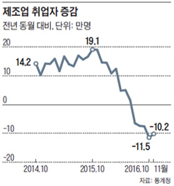 조선업 등 산업 구조조정 한파(寒波)가 고용 시장에 불어닥치면서 11월 제조업 종사자 수가 5개월 연속 감소했다. 11월 청년 실업률은 13년 만에 최고치를 기록했다. 내년 초 졸업 철까지 겹치면 '고용 빙하기'가 닥칠 것이라는 우려가 나온다.