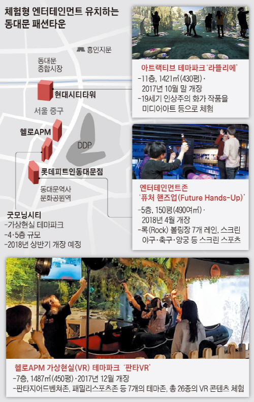 서울 동대문 패션타운에 신개념 엔터테인먼트 공간이 속속 들어서고 있다. 온라인 쇼핑몰에 손님을 빼앗기고, 중국인 관광객 감소로 폐점까지 고민하던 대형 쇼핑몰들이 첨단 엔터테인먼트 시설들을 잇따라 유치해 상권 활성화를 모색하는 것이다.
