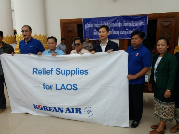 지난 7월 23일 라오스 남동부 아타푸 주(州)에 시공 중인 대형 수력발전댐의 보조댐 사고로 현지에는 수백명의 사망자와 실종자, 6천여명의 이재민이 발생했다. 대한항공은 라오스 재난 지역에 가까이 접근할 수 있는 정기 항공편을 이용해 생수 36,000리터(1.5리터짜리 24,000병)와 담요 2,000장 등 약 42톤의 구호품을 전달했다.