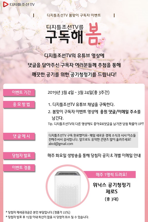 '디지틀조선TV를 구독해봄' 이벤트는 디지틀조선TV의 유튜브 채널을 구독한 뒤, 이벤트 게시글에 응원 댓글을 작성하는 방식으로 누구나 참여할 수 있다. 오는 24일까지 진행되는 이번 이벤트는 참여자 중 추첨을 통해 총 3명에게 '위닉스 공기청정기 제로S'를 증정한다. 최근 연일 계속되는 최악의 미세먼지에 소비자들이 괴로워하고있는 만큼, 화창하고 깨끗한 봄날씨를 희망하는 마음으로 공기청정기를 증정하기로 했다.