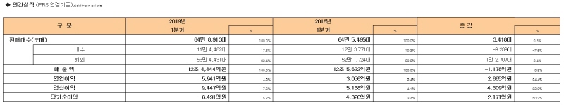 회사는 "국내 등 일부 지역 판매 감소와 RV 주력 모델 노후화로 인해 매출액은 소폭 줄어들었으나 판매단가 상승, 북미 수익성 개선 및 통상임금 소송 충당금 환입 등에 따른 매출원가 감소로 영업이익은 크게 늘었다"고 설명했다.