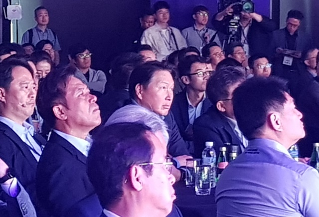 최태원 SK 회장(가운데)과 박정호 SKT 사장(왼쪽 세번째)가 28일 서울 워커힐 호텔에서 열린 2019 소셜밸류커넥트 컨퍼런스에서 기조연설을 경청하고 있다 /사진=정문경 기자