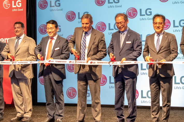 LG전자가 현지시간 29일 美 테네시(Tennessee)주 클락스빌(Clarksville)에 위치한 테네시 생산법인에서 'LG전자 테네시 세탁기공장 준공식'을 가졌다. (왼쪽부터) 마크 그린(Mark Green) 美 연방의회 하원의원, LG전자 북미지역대표 조주완 부사장, 빌 리(Bill Lee) 테네시주 주지사, 송대현 LG전자 H&A사업본부장, 김영준 주애틀랜타 총영사/LG전자 제공