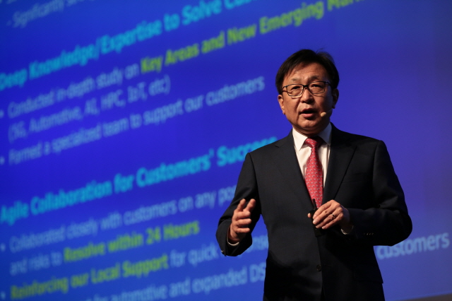 지난 7월3일 서울 그랜드 인터컨티넨탈 파르나스 호텔에서열린 '삼성파운드리 포럼 2019 코리아' 행사에서 정은승 삼성전자 파운드리사업부 사장이 3일 기조 연설을 하고 있다. /삼성전자 제공
