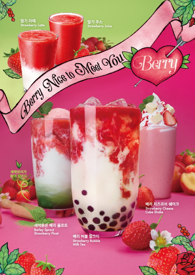 이번에 선보인 딸기 음료는 총 7종으로 고소한 새싹보리가 들어간 라떼에 딸기 젤라또가 올라간 '새싹돋은 베리 플로트', 버블 밀크티에 딸기를 더해 상큼하고 달콤한 맛이 특징인 '베리 버블 밀크티', 딸기 쉐이크 위에 큐브 치즈 케이크를 올린 '베리 치즈큐브 쉐이크' 등이다.
