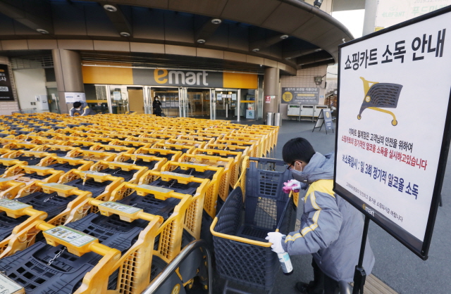 직원들이 이마트 월계점에서 고객용 카트 소독작업을 하고 있다./이마트 제공