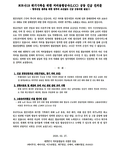 또 공항사용료 및 세금의 유예가 아닌 전면 감면 조치 시행해 줄 것을 요청했다. LCC사장단은 "현재 정부가 제시한 공항사용료 등 각종 비용지원은 감면이 아닌 납부유예로 실질적 지원이 못된다"며 "항공기 재산세, 항공유 수입관세 등 추가적으로 각종 세금 감면을 지원해 달라"고 촉구했다.