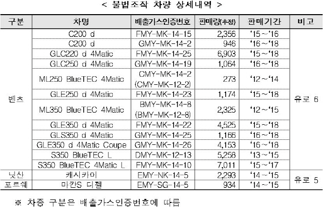 구체적인 모델과 판매량은 벤츠의 경우 C200d(배출가스 인증번호에 따라 2종으로 계산), GLC220 d 4매틱, GLC250 d 4매틱, ML250 블루TEC 4매틱, GLE250 d 4매틱, ML350 블루TEC 4매틱, GLE350 d 4매틱, GLS350 d 4매틱, GLE350d 4매틱 쿠페, S350 블루TEC L, S350 블루TEC 4매틱 L 등 12종 3만7154대, 닛산은 캐시카이 1종2293대, 포르쉐는 마칸S 디젤 1종 934대다.