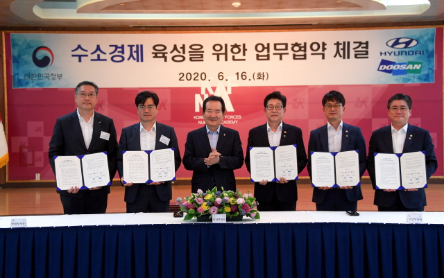 현대차는 16일 대전시 유성구 자운대에서 정세균 국무총리, 조명래 환경부 장관, 현대차 공영운 사장, 이두순 두산모빌리티이노베이션 대표이사 등 주요 관계자들이 참석한 가운데 국방부 수소버스 도입 및 수소충전소 구축 추진을 위한 상호협력 양해각서(MOU)를 체결했다고 밝혔다.