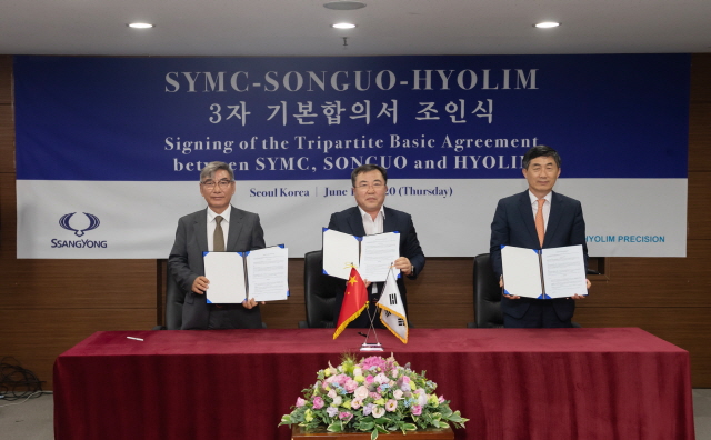 쌍용차, 중국 송과모터스, 효림정공 등 3사 대표들이 지난 18일 쌍용차 서울사무소에서 계약서에 서명 후 기념촬영을 하고 있다. 왼쪽부터 신용복 중국 송과모터스 총재, 예병태 쌍용차 대표이사, 김종진 효림정공 사장. /쌍용차 제공