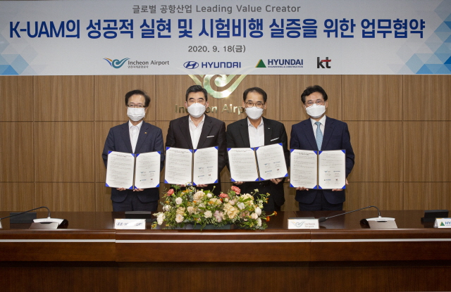현대자동차가 인천국제공항공사, 현대건설, KT와 한국형 도심항공교통(K-UAM)의 성공적인 추진과 시험비행 실증을 위한 업무협약(MOU)을 체결했다고 21일 밝혔다.