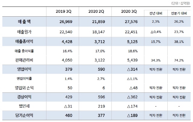 이 결과 3분기 영업이익은 전년 동기 대비 6923억원이 감소해 3138억원의 영업적자를 기록했다. 영업이익률은 전년 동기 대비 2.5%포인트 하락한 마이너스 1.1%를 나타냈다.