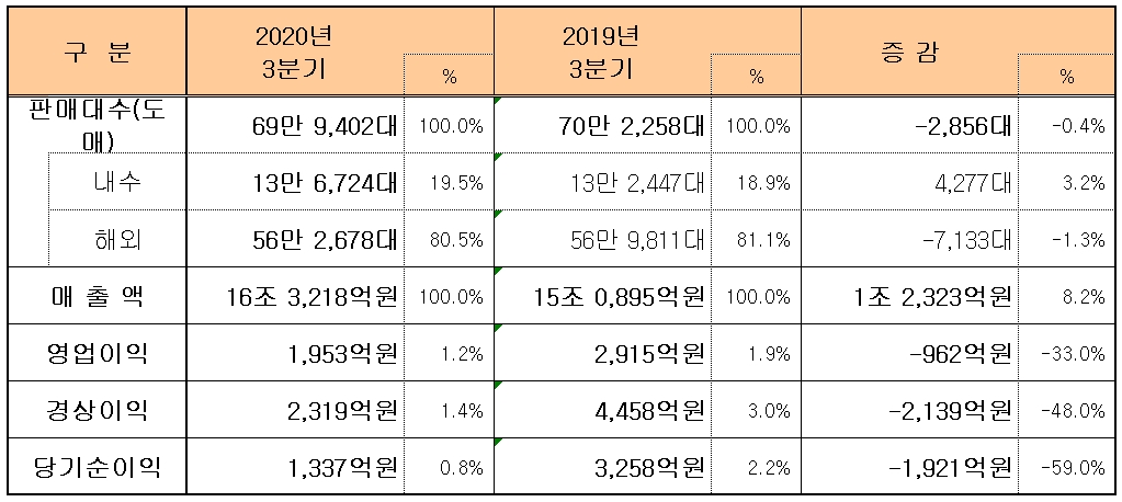 3분기 매출액은 판매 감소와 원-달러 환율 소폭 하락에도 불구하고 K5·쏘렌토·카니발 등 신차와 RV 중심 판매 믹스 개선에 따른 대당 단가 상승으로 전년 대비 8.2% 증가한 16조3218억원을 기록했다.