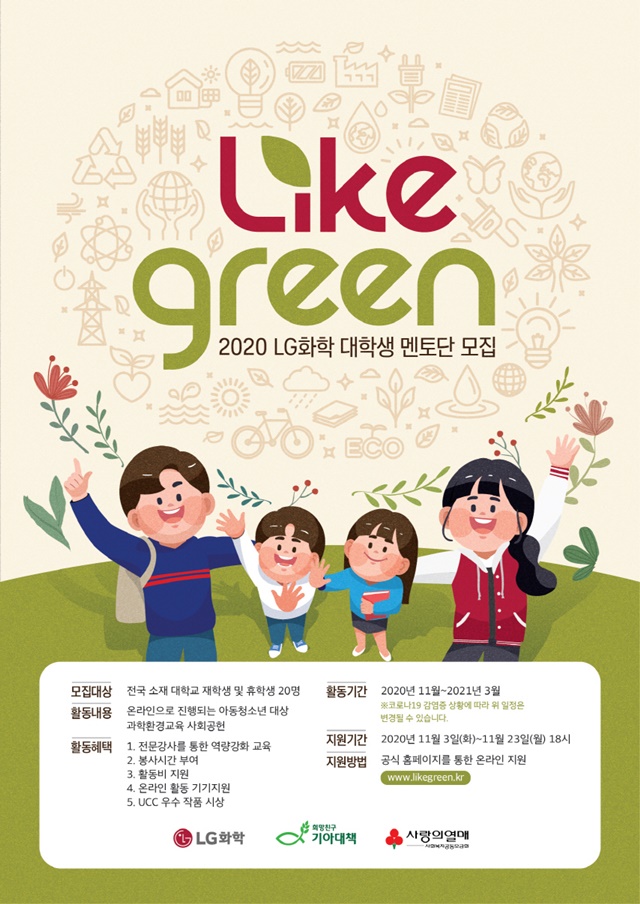 이와 관련 LG화학은 이날부터 ‘LIKE GREEN’을 이끌어 갈 대학생 멘토단을 모집한다고 밝혔다.