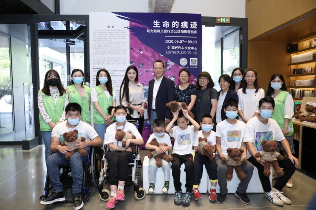 지난 9월 현대모터스튜디오 베이징에서 뇌성마비아동 그림전 참가자와 임직원 봉사단이 기념 촬영하고 있다. /현대차그룹 제공