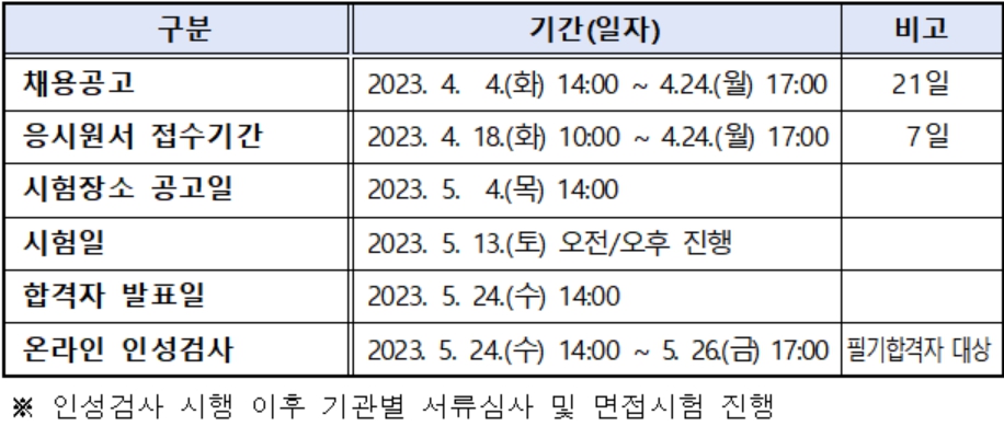 필기시험은 5월 13일에 치러질 예정이며, 장소는 통합채용 누리집 등을 통해 별도로 공고될 예정이다.